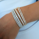 An icon of refined style. Our Classic 4mm Tennis Bracelet features a continuous line of brilliant-cut cubic zirconia, each stone precisely set to maximise light and brilliance. Available in both gold and silver finishes, it’s a versatile piece that transitions effortlessly from day to night.
